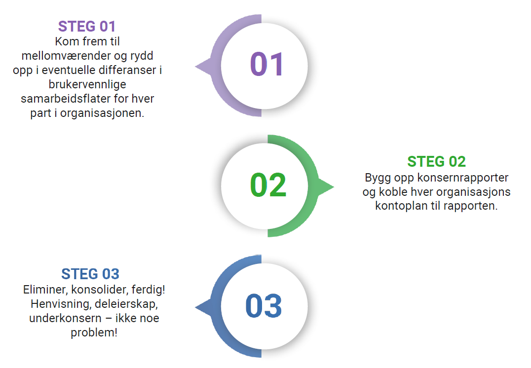 Hver enhet har en flate for mellomværender, der eventuelle differanser mellom enhetene tydelig vises og kan kommuniseres. Matchingsradene er koblet til rapportradene, noe som muliggjør korrekt håndtering av noter allerede ved mellomværendene. Rapportene håndterer hver enhets individuelle kontoplan, og tallene sammenstilles automatisk. Resultatet blir en tydelig oversikt over konsolideringen, der elimineringene lett kan etterspores, og konsernrapportene automatisk genereres. Konsernregnskap har aldri vært enklere!